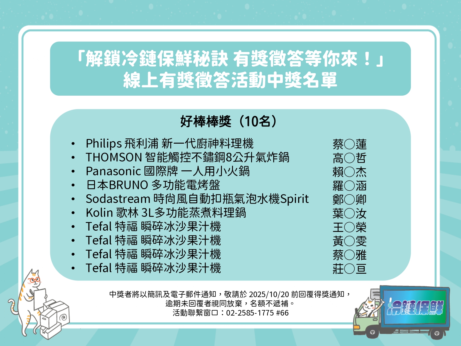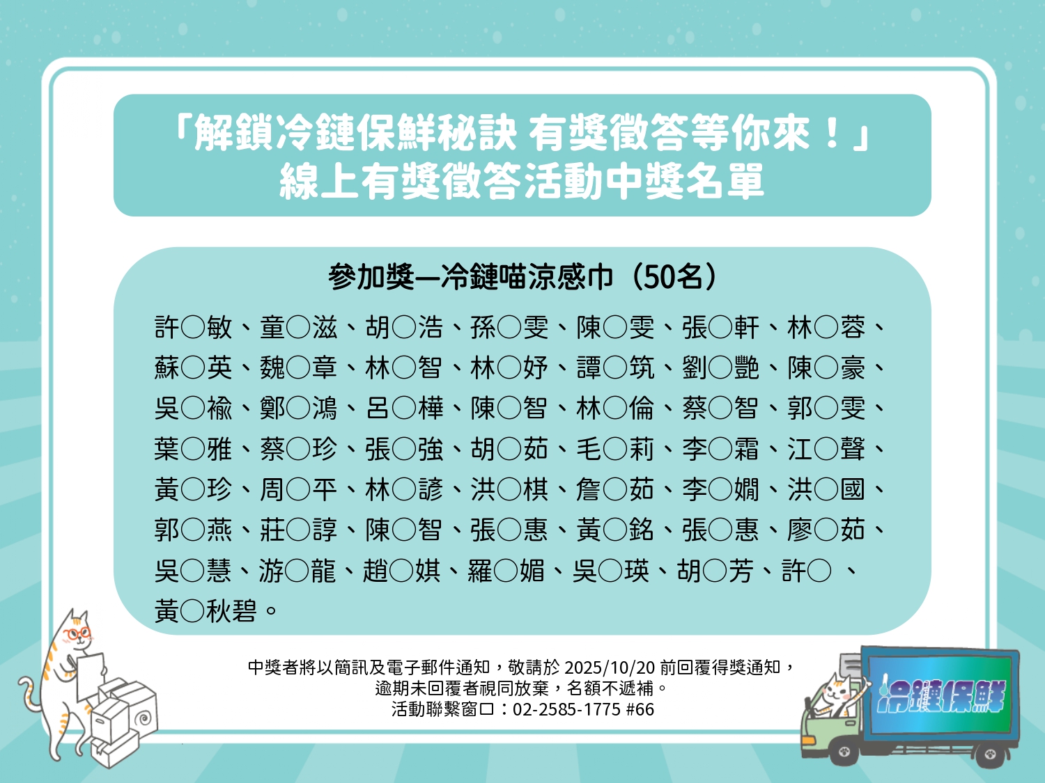 為推廣農糧冷鏈保鮮技術,特舉辦「解鎖冷鏈保鮮秘訣 有獎徵答等你來!」線上活動,邀請消費者購買冷鏈業者的產品,即可掃描活動貼紙參加線上問答並登錄抽獎。活動期間(2025年7月1日至2025年9月30日)吸引全台各地消費者熱情參與,活動得獎名單已出爐!恭喜所有幸運得獎者!