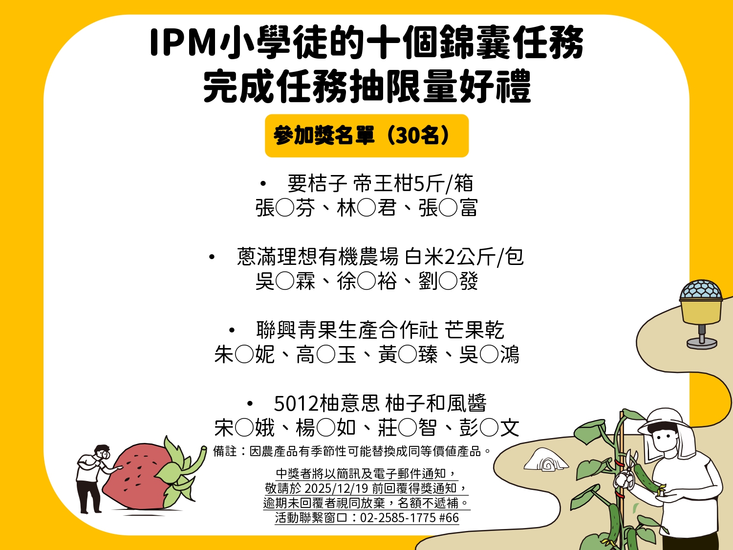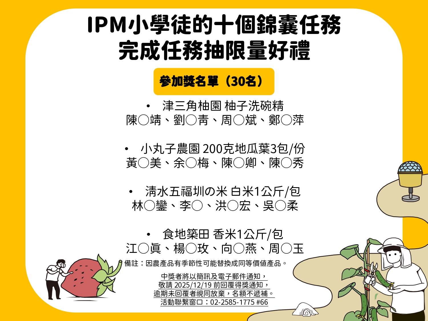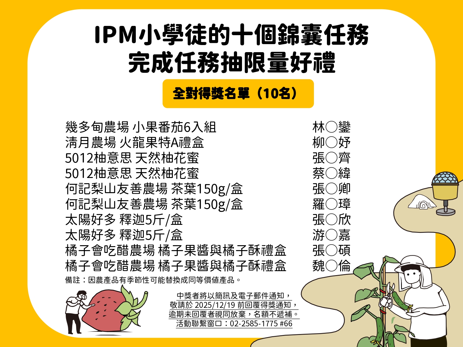 為推廣IPM技術,特舉辦「IPM小學徒的十個錦囊任務|完成任務抽限量好禮!」線上活動,邀請消費者購買永續善農獎獲獎者的產品,即可掃描活動貼紙參加線上問答並登錄抽獎。活動期間(2025年9月1日至2025年11月30日)吸引全台各地消費者熱情參與,活動得獎名單已出爐!恭喜所有幸運得獎者!