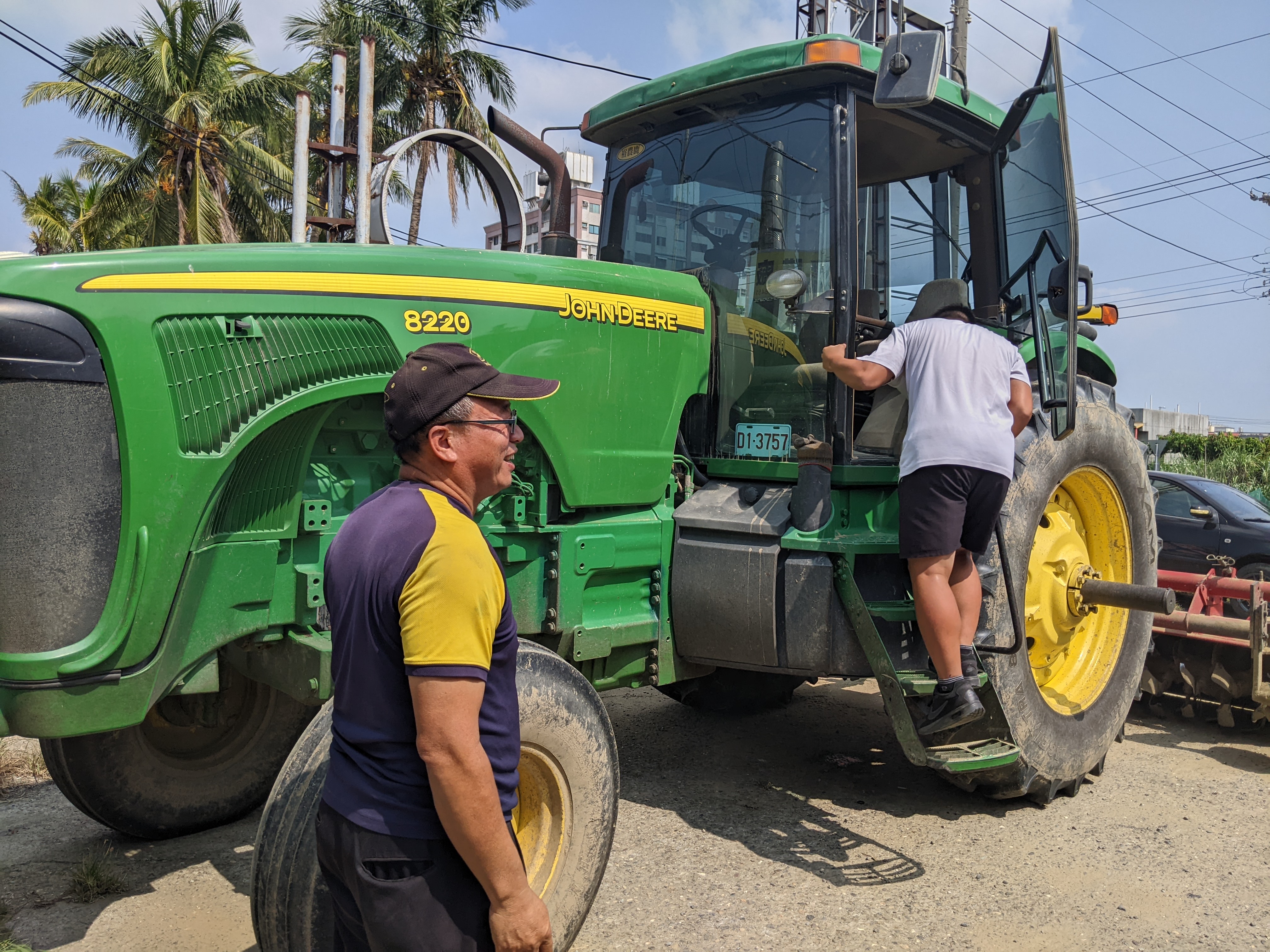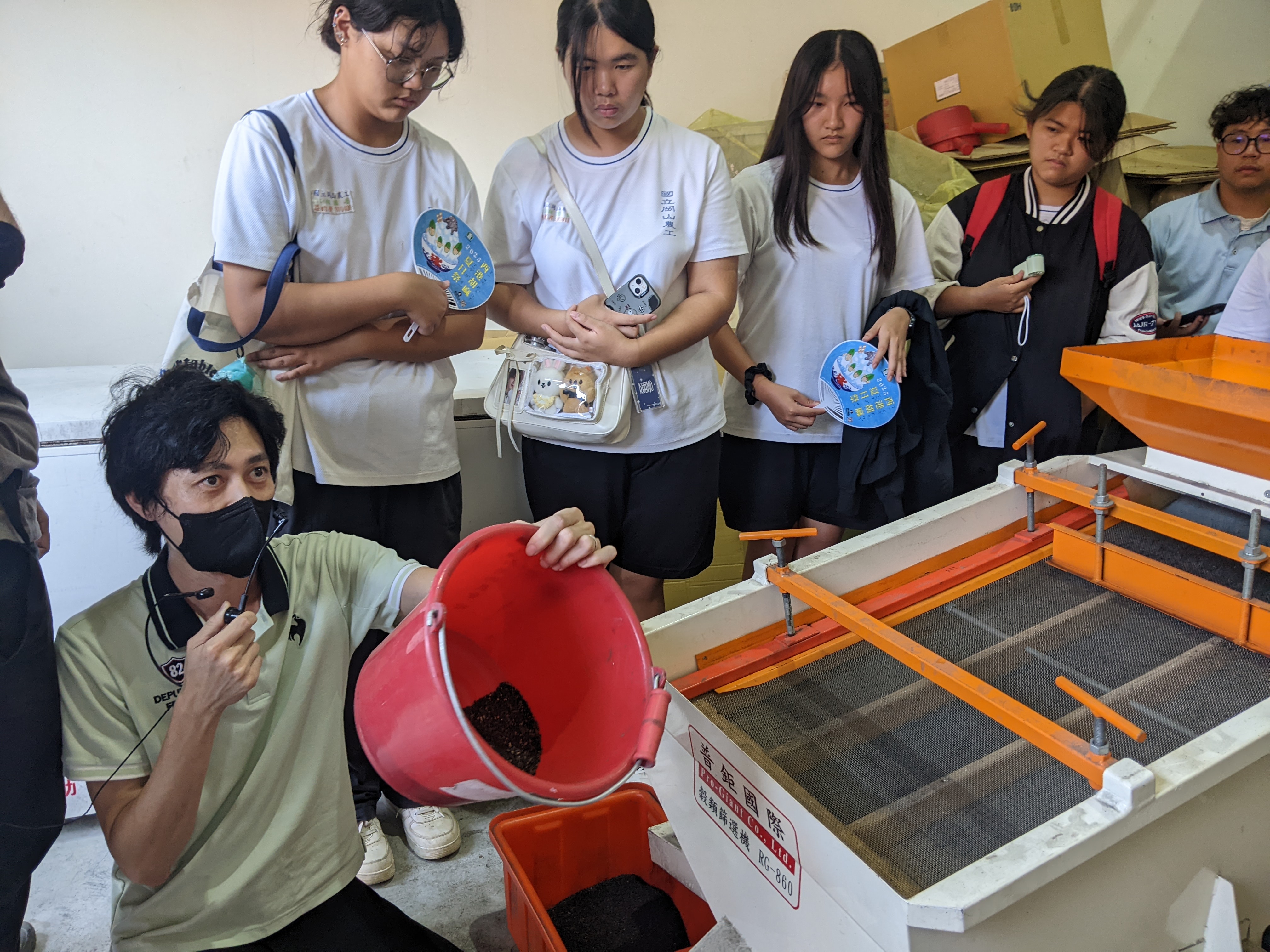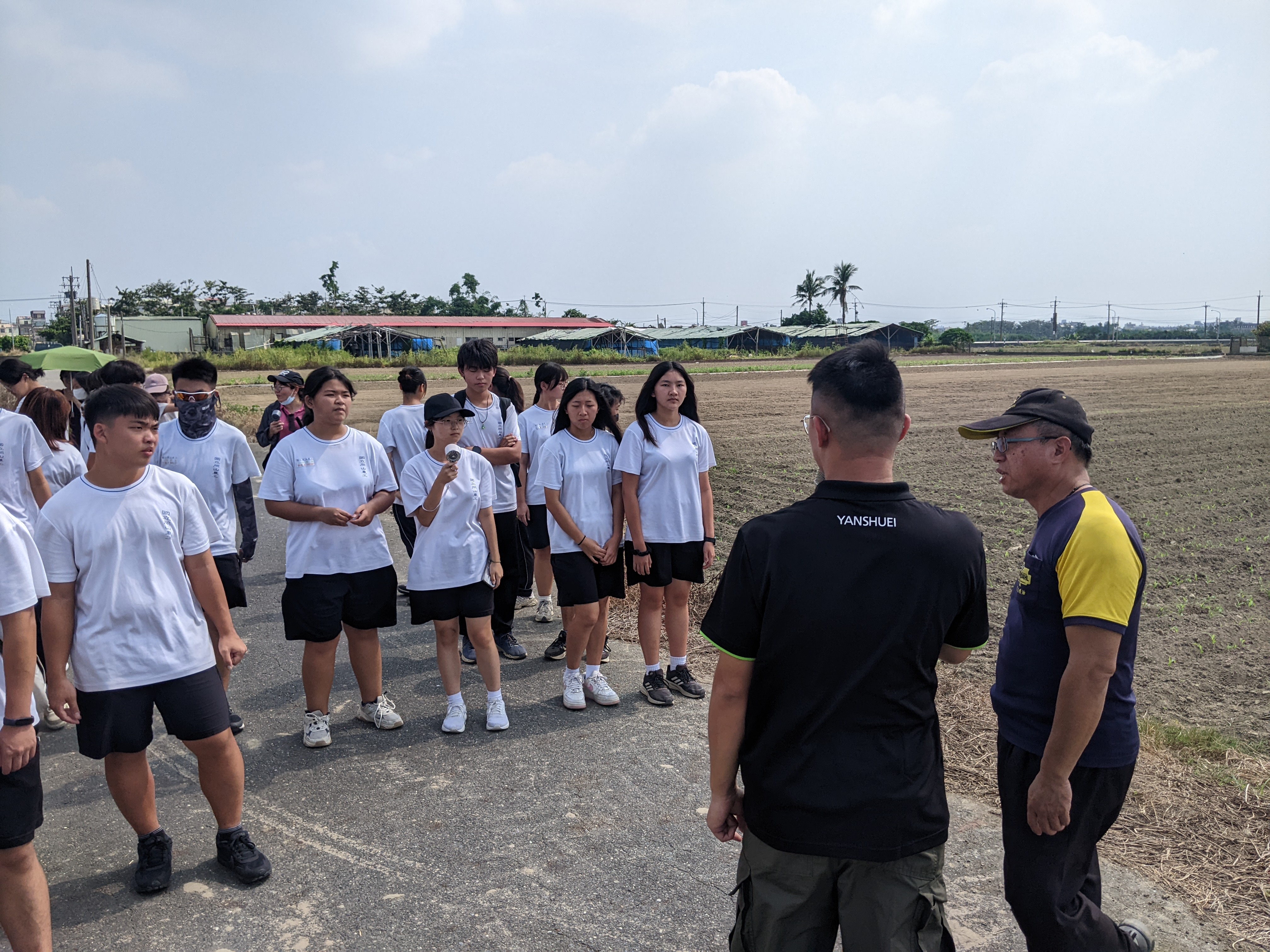 田間參訪由農友謝大哥帶領,實地觀察硬質玉米的生育情形,說明病蟲害防治與土壤管理,面對人力短缺,自己特別去學習考證照,使用無人機防治噴藥,並示範省工機具的使用與田間作業重點。有學生對秋行軍蟲防治特別感興趣,謝大哥也分享如何在玉米上黏藥的防治方式。