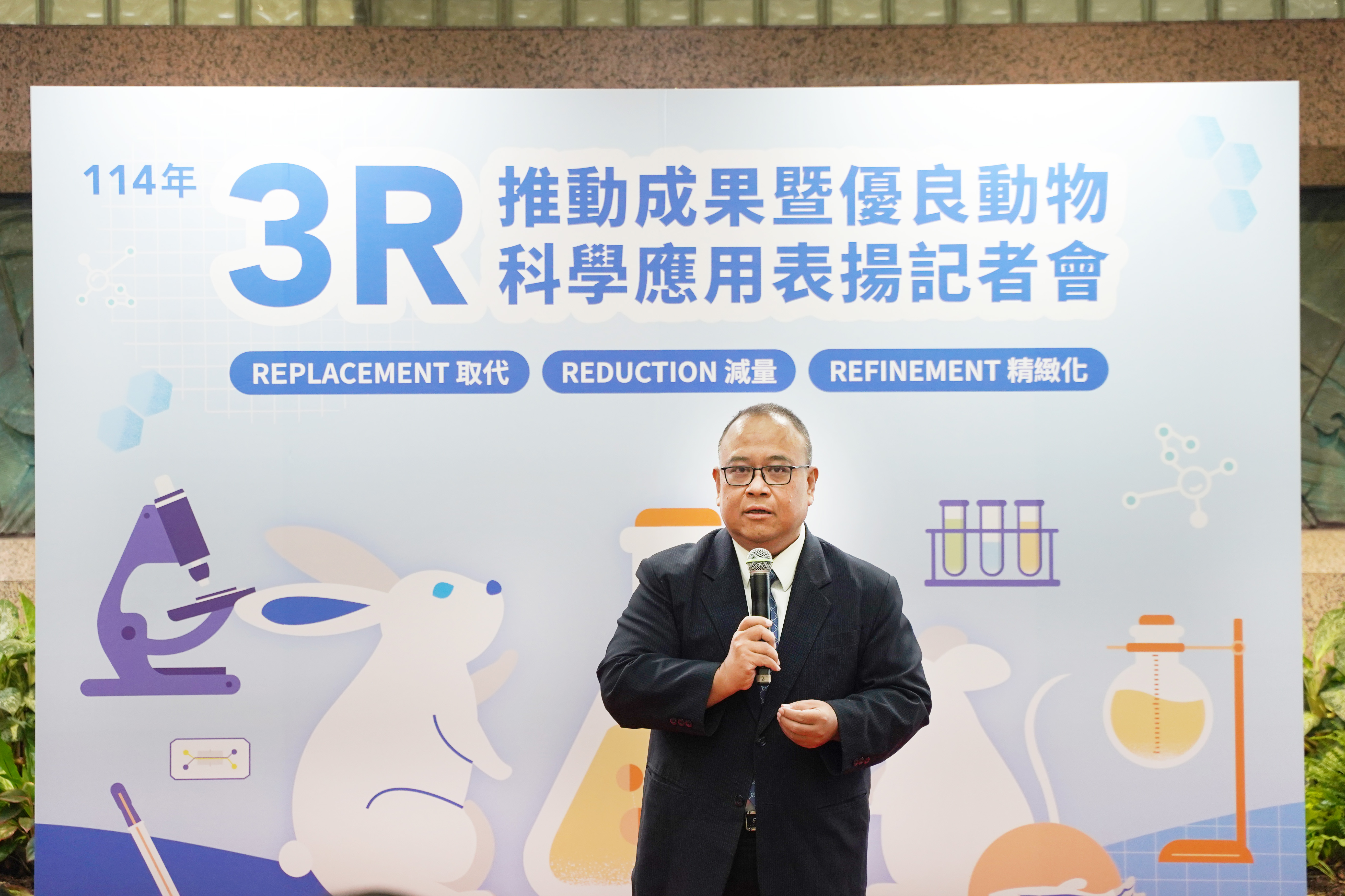 記者會首先由農業部動物保護司江文全司長,以及進階生物科技股份有限公司洪昭竹顧問致詞。江文全司長指出透過持續推動3R原則,全國實驗動物使用量已較過往減少約9%,顯示相關政策已逐步在研究與管理實務中發揮成效。洪昭竹顧問表示隨著研究倫理逐步發展,研究人員對實驗動物的態度從實驗材料逐步轉變為「值得尊敬的生命」,發展3R原則是愛護生命的研究趨勢。
