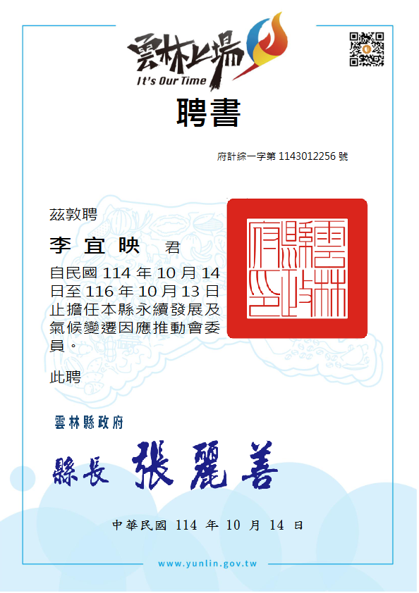 本會理事長李宜映博士近日獲雲林縣政府聘任,擔任「雲林縣永續發展及氣候變遷因應推動會」委員。該推動會由雲林縣縣長張麗善主持,旨在整合縣府與民間專業資源,推動地方永續治理、氣候變遷調適及淨零轉型等相關政策。