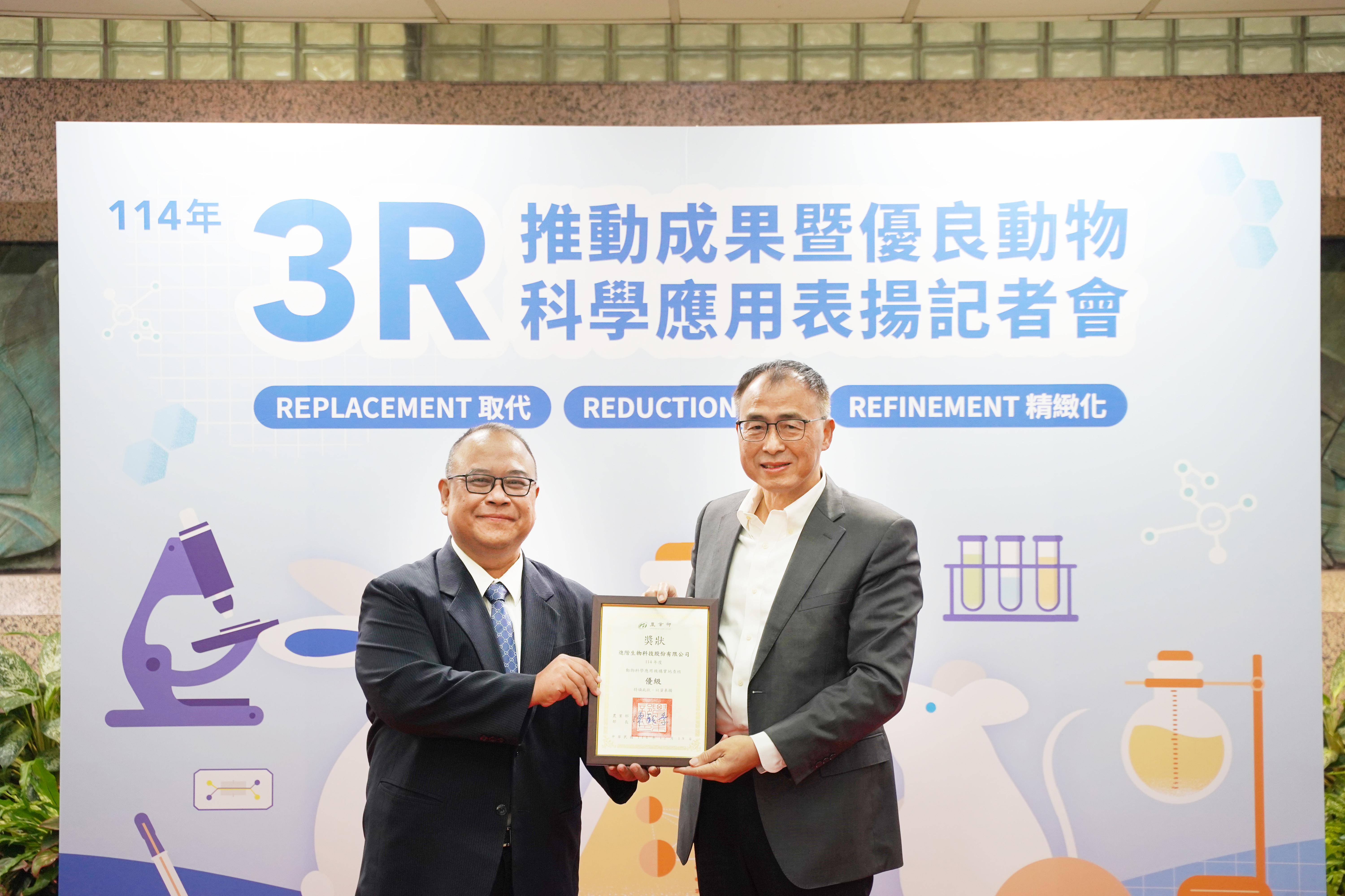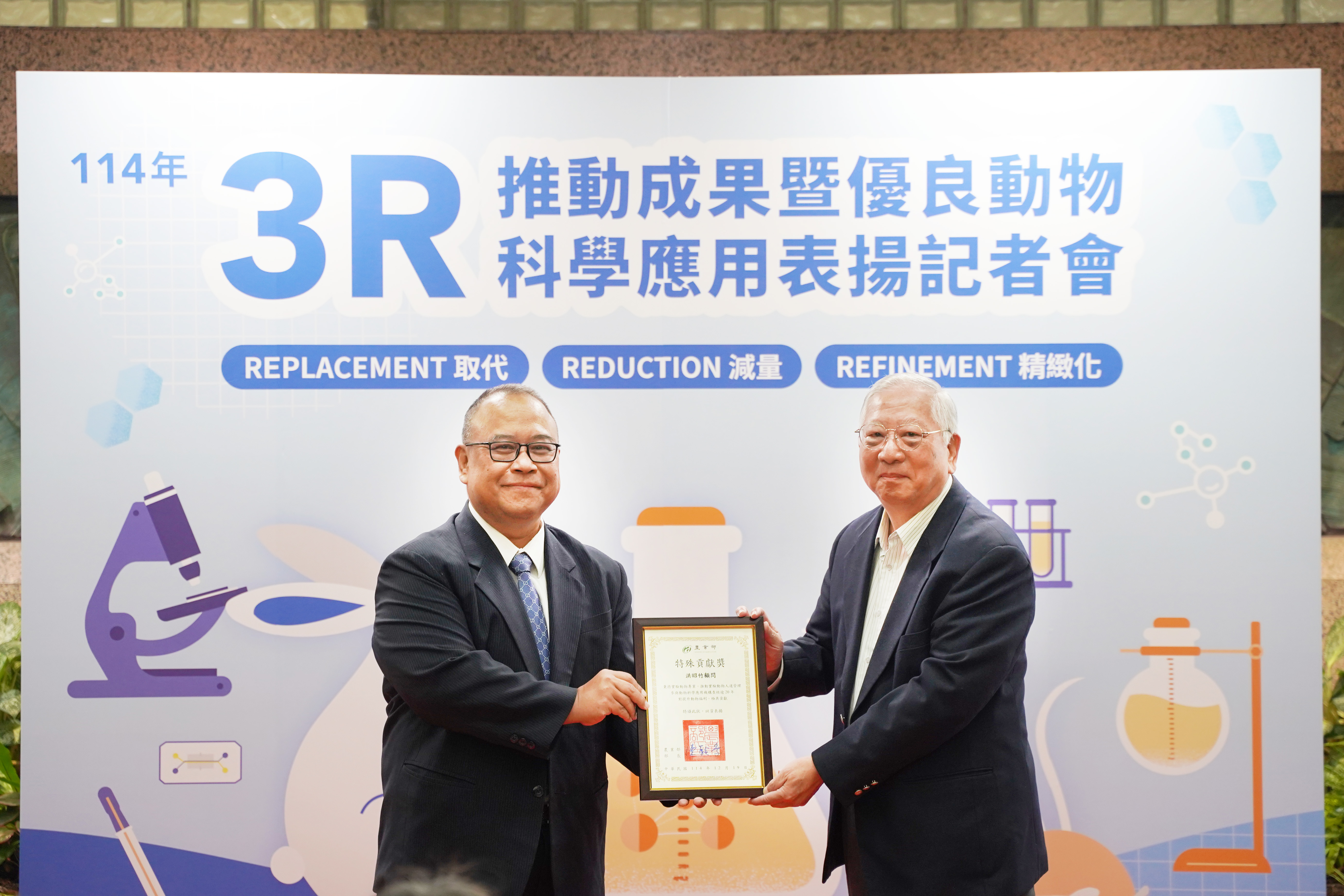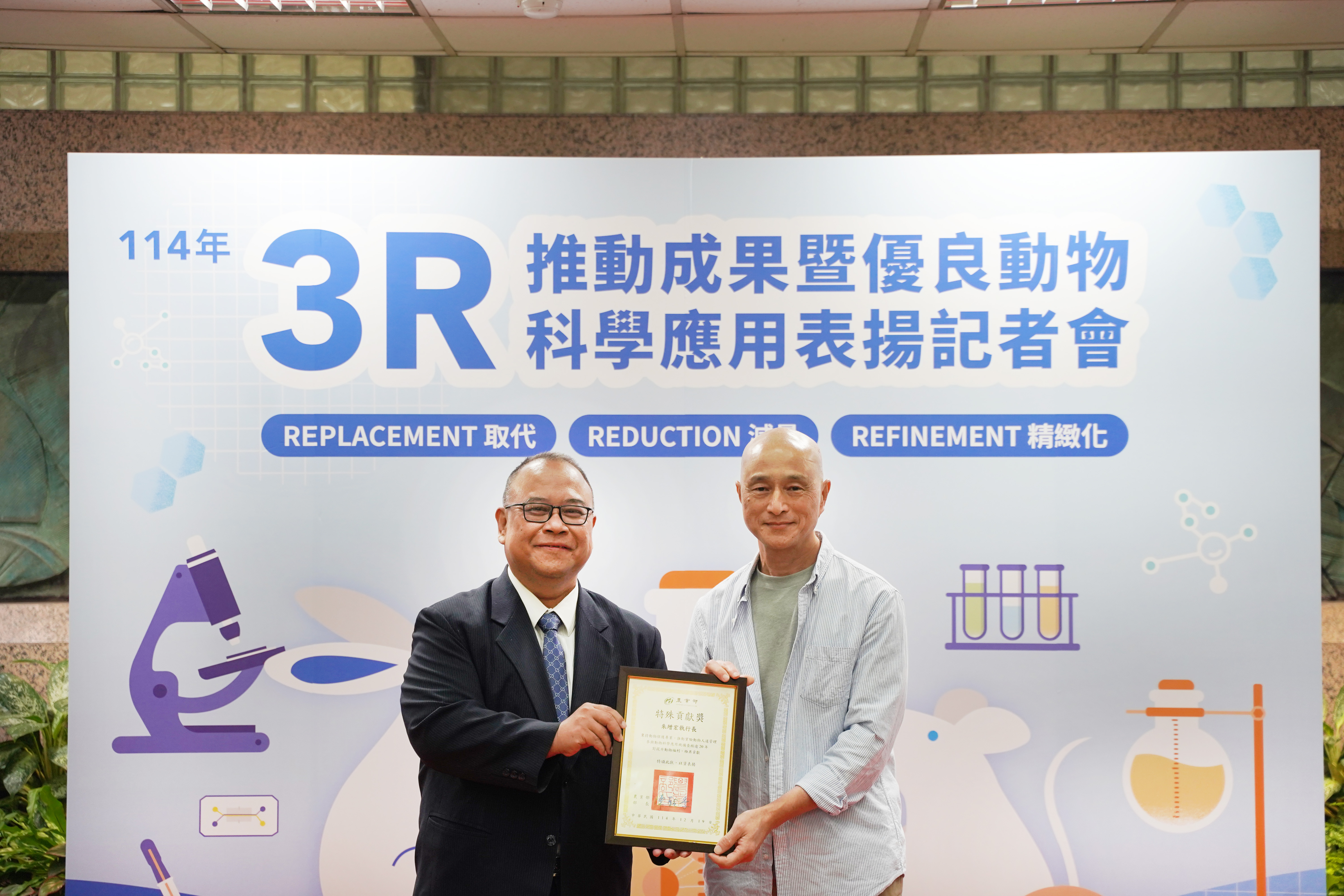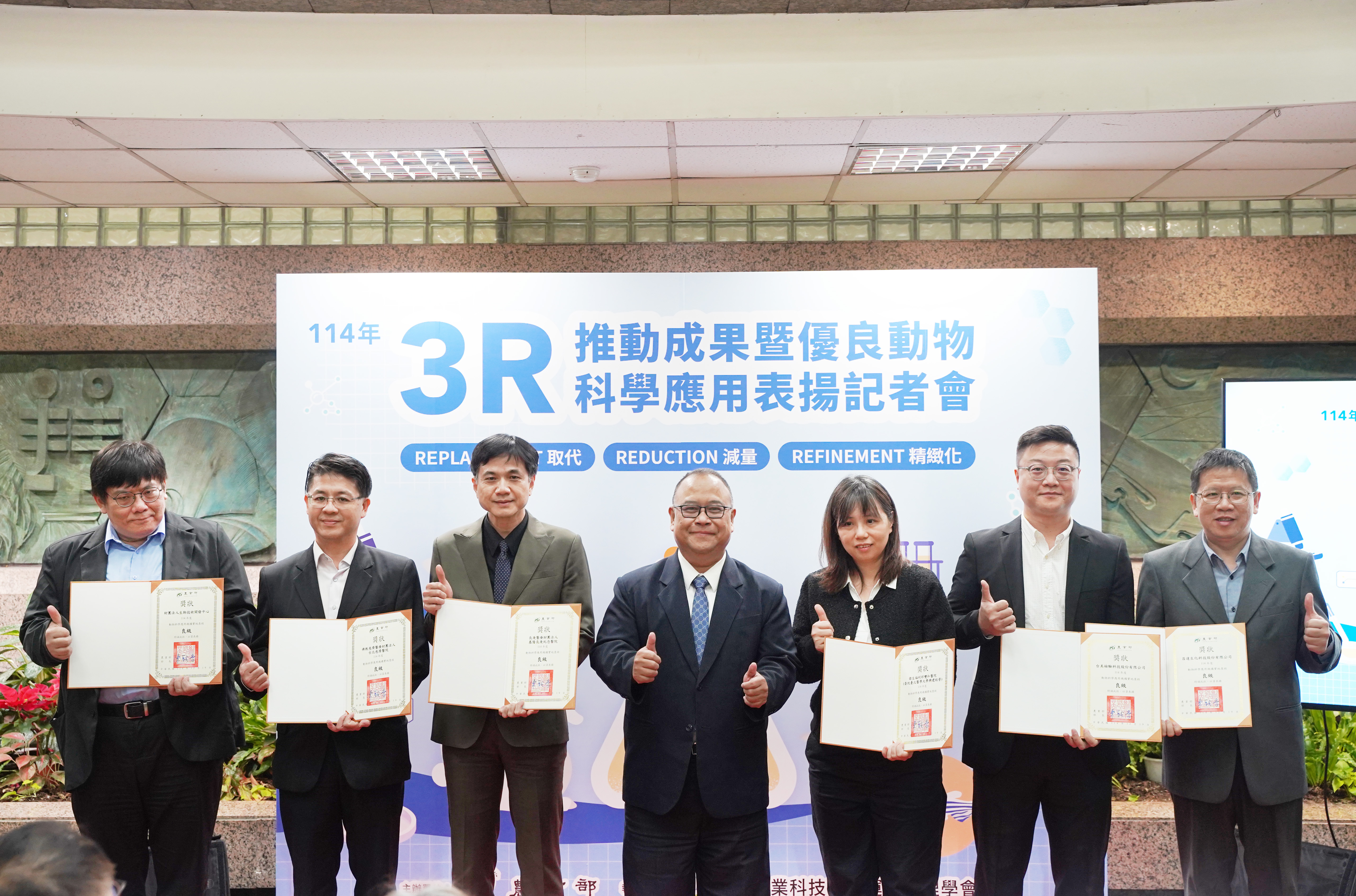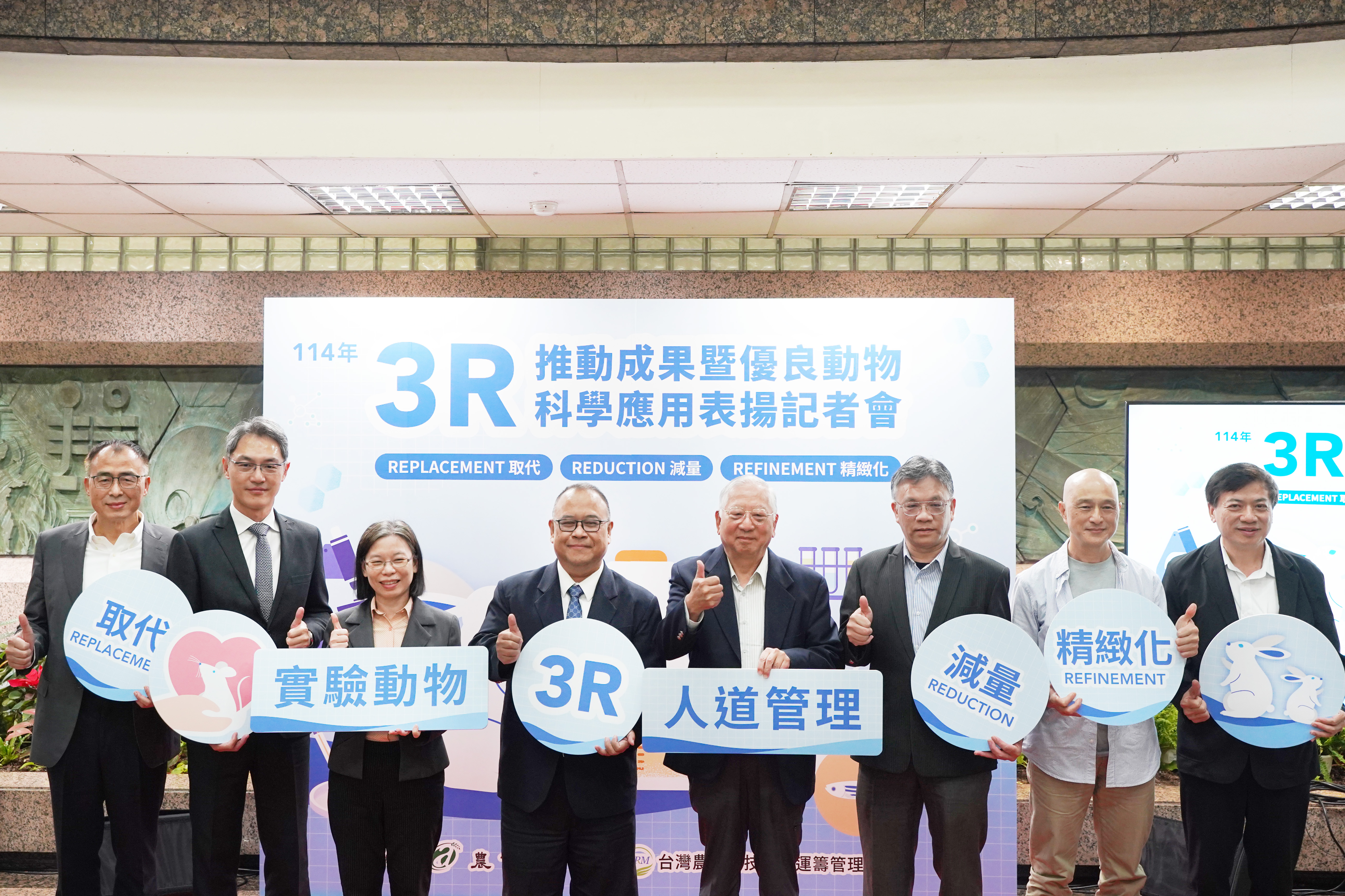 面對國際研究倫理提升與動物替代科技快速發展趨勢,我國積極推動3R(取代、減量、精緻化)理念,建立以科學驗證、制度化管理與產業應用並進的永續科研模式。本次記者會旨在呈現農業部在實驗動物3R成果,動物替代技術研發、法規建構與推廣實務的階段成果,並表揚114年度農業部實地查核評核為優、良等級的動物科學應用機構,與協助農業部建立實驗動物人道管理制度超過20年的專家,期強化社會對實驗動物福利與科研倫理的認識,並深化跨領域合作,共同推動符合國際規範並兼顧科研目的之替代方法。