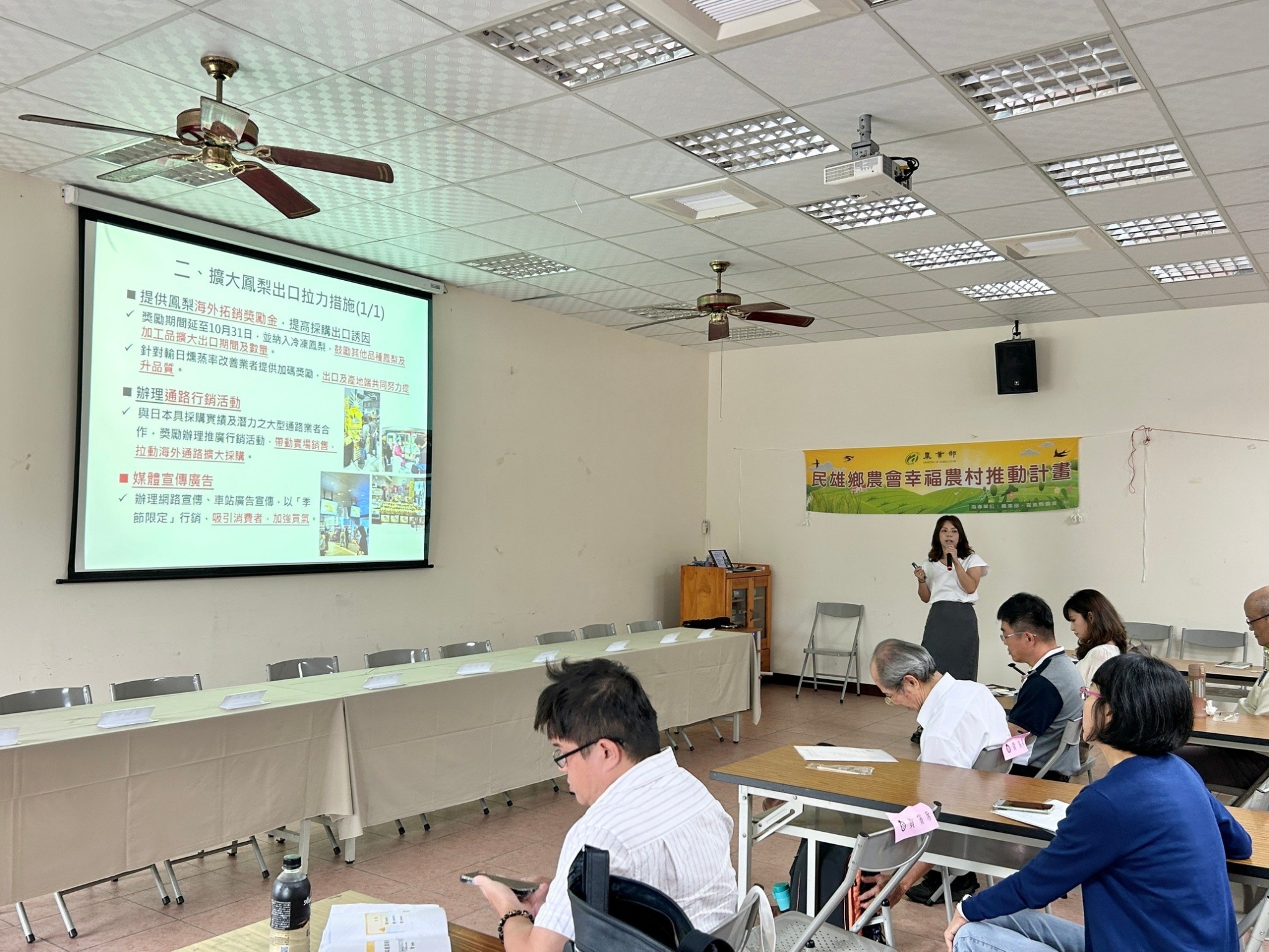 農業部農業試驗所於113年9月20日在嘉義縣民雄鄉農會舉辦「外銷鳳梨產銷技術座談會」,分享最新的外銷市場現況、外銷鳳梨品質管理技術及病蟲害防治策略。座談會吸引來自嘉南地區合作社、農民及外銷貿易業者等超過40位代表熱情參與,民雄鄉農會陳加茂總幹事也率領同仁到場響應。