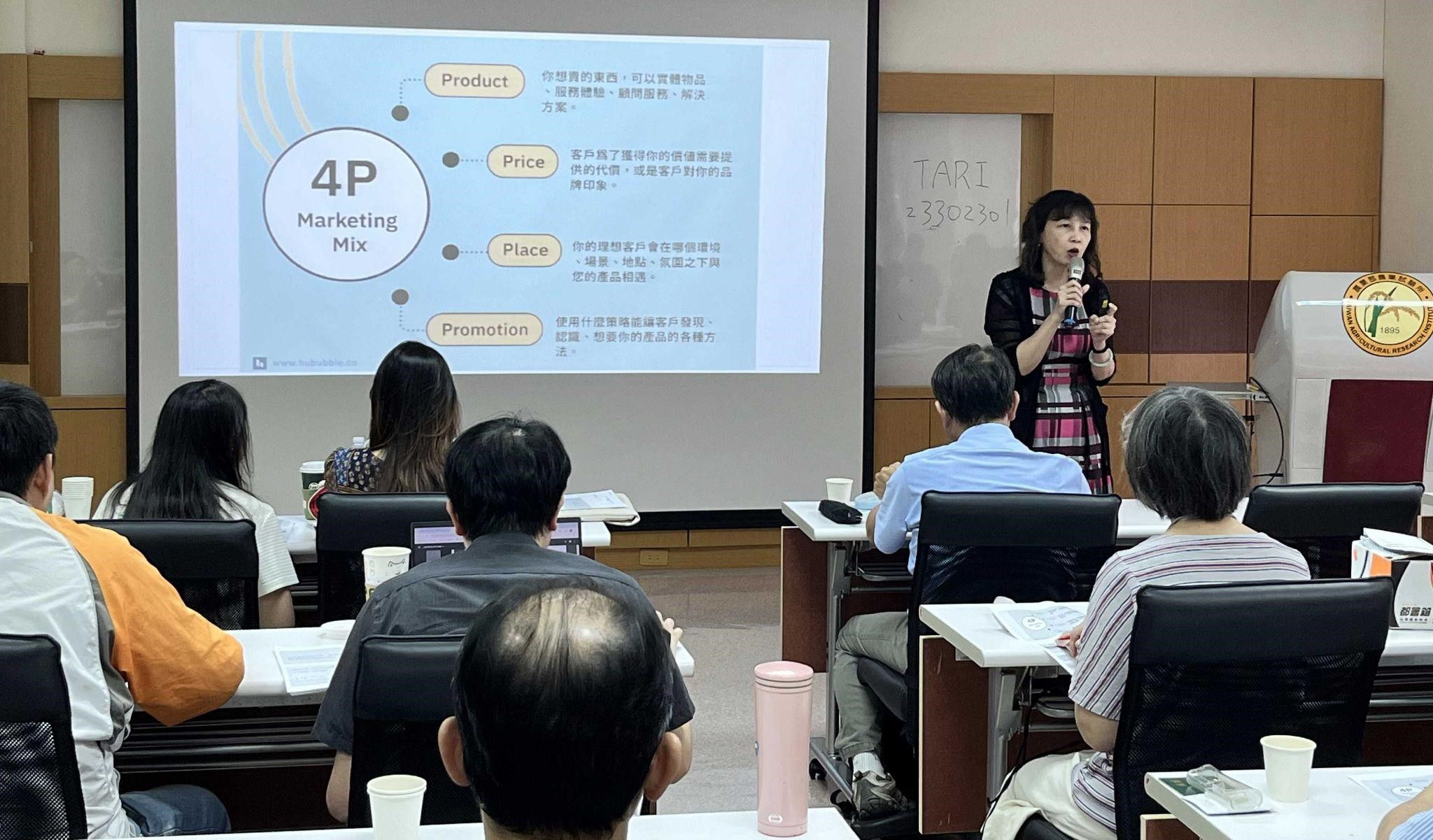第一位講師是東吳大學企管系歐素華副教授,她介紹行銷學的4P理論(Product,Price,Place,Promotion)和BCG矩陣,要大家跳脫傳統行銷只賣「產品」的思維。「賣產品、服務、體驗?你們要怎麼賣?」她認為六級農產品最厲害的行銷手段是「體驗」,而最棒的「體驗」是讓消費者有吸收知識、育教於樂的感受。最後她舉流行病的傳播原理,讓研究人員思考:農改場研發的新技術(傳染原)是否夠有特色?接受新技術的傳播者(散播傳染原的人)是否夠活躍能到處串聯人際網絡?市場(傳染原活動的大環境)成熟嗎?友善嗎?