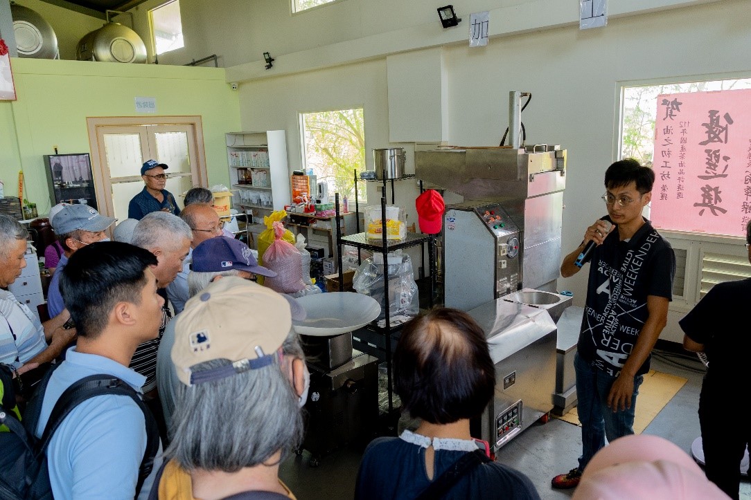 下午,針對嘉義地區農友想要了解油茶籽榨油過程及智慧化省工栽培需求,特別邀請112年度國產茶油品評遴選金評獎優選得主-方茂榮負責人帶領農友觀摩油之初工坊,解說螺旋式榨油及餅式榨油、冷壓及熱榨的特色,並說明如何榨出品質優良的茶油,接著由寰宏農業科技張永達副理向農友介紹農用植保機於油茶栽培上的應用。學員對於參觀榨油工坊反應十分熱烈,並積極討論,他們表示以前較無機會參觀榨油工廠,透過此次參訪學習到榨油的許多細節;另一位學員表示,原來農用植保機不只是用於施藥,也可以利用來施肥,以達到省工效果。